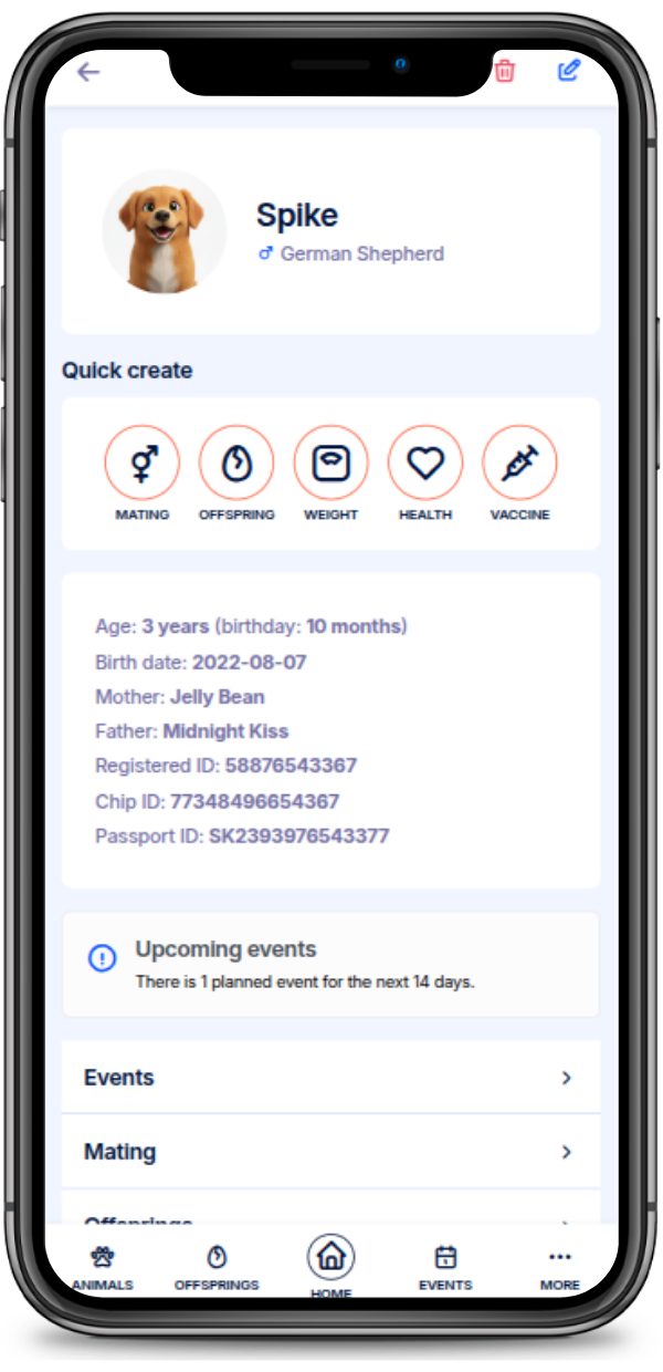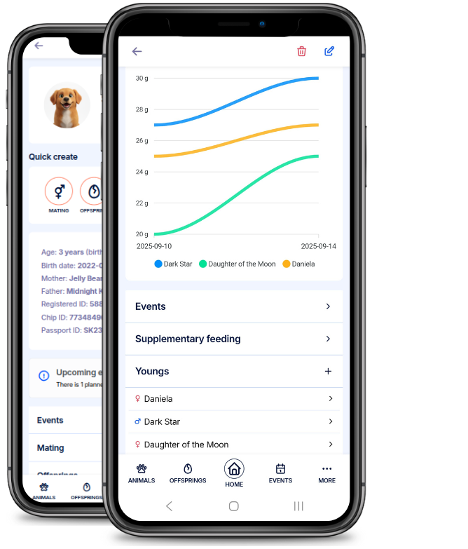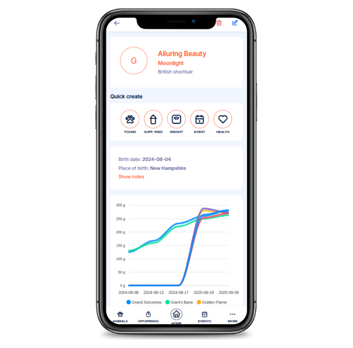 Sleduj pokrok pomocou jasných grafov, aby si mohol robiť spoľahlivé, dátami podložené rozhodnutia. Poskytni profesionálne záznamy – kompletnú digitálnu históriu zvieraťa – na posilnenie svojej reputácie v rámci chovateľskej komunity.